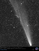 C/2006 S5 (Hill) - (CK06S050): cometa a lungo periodo scoperta la notte del 28 settembre 2006 da R. E. Hill del Catalina Sky Survey, proiettandosi nella costellazione dei Pisces, quand'era di magnitudine 18,6^. La cometa ha raggiunto la massima luminosità (mag. +13,0^) intorno alla fine dell'anno 2007-2008 (S.Yoshida). La cometa Hill è stata qui documentata per un periodo che va dal 9 dicembre 2007, al 26 gennaio 2008, utilizzando soltanto la Flat Field Camera della Lichtenknecker Optics F= 760mm f/4,0 |